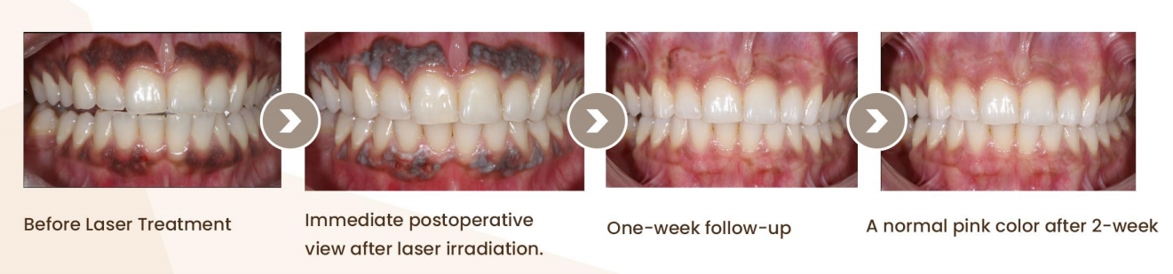 - Significant pigmentation reduction in just 1-2 sessions, with natural pink gums restored with 2 weeks.